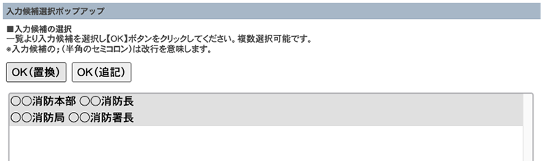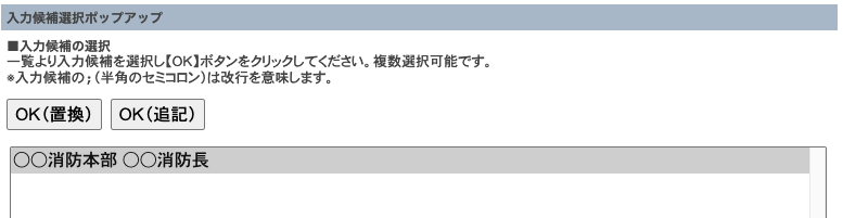 | 【追加】 | ボタン下部にある入力フィールドの内容を入力候補一覧に追加します。 複数行での追加が可能です。複数行の内容で追加した入力候補は、 一覧では改行を半角のセミコロン「;」で表示します。 |