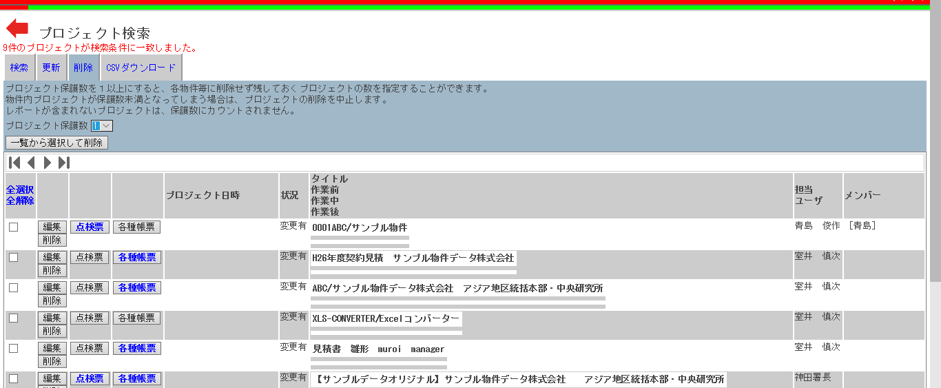 ここでは、『1.指定した期間のプロジェクトを検索する』で検索したプロジェクトを一括削除することができます。